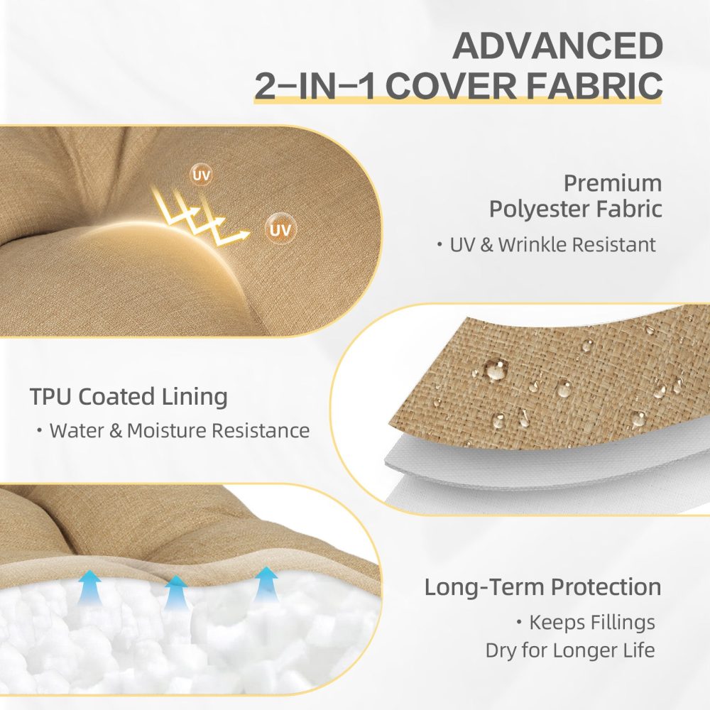 - Built to Last Outdoors: Crafted from 240GSM high-quality polyester staple fiber, these cushions resist fading and wrinkles through countless seasons. The hidden TPU water-resistant coating acts as a protective barrier, blocking moisture and liquid from reaching the inner fill. This means your cushions stay fresh and comfortable, whether you’re relaxing in morning dew or afternoon showers.