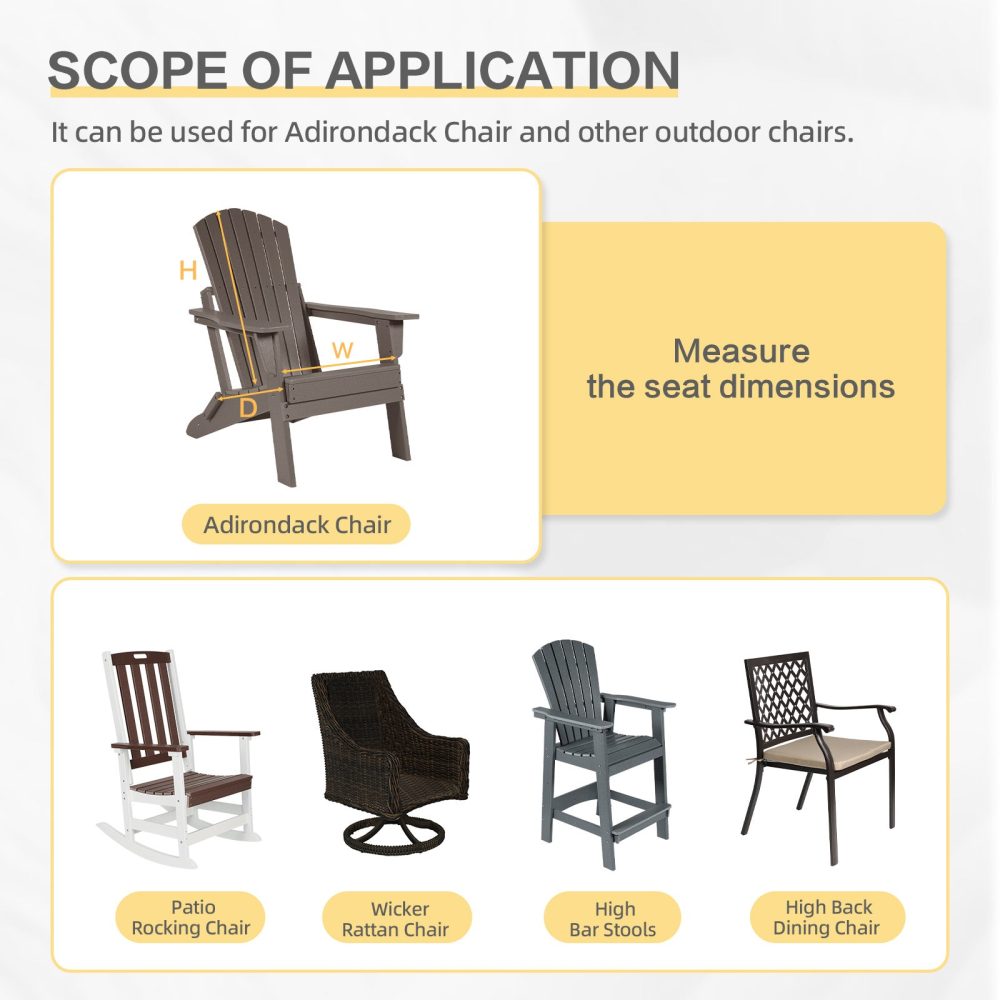 - Versatile Style Options: Available in multiple colors including rich brown Adirondack chair cushions and other popular shades to complement your outdoor décor. Before ordering, we recommend measuring your furniture to ensure the perfect fit for your specific setup.
